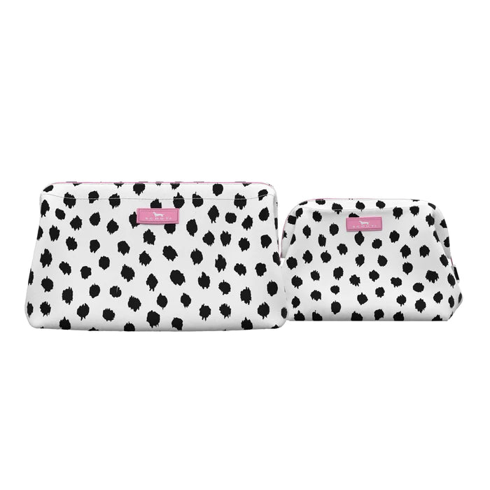 Open… WIDE! Designed for maximum access, this easy-clean bag not only opens up wide but it stays open thanks to a built-in wire frame. Ideal for travel (three-ounce bottles fit upright) or at-home countertop use. Smaller version also available.