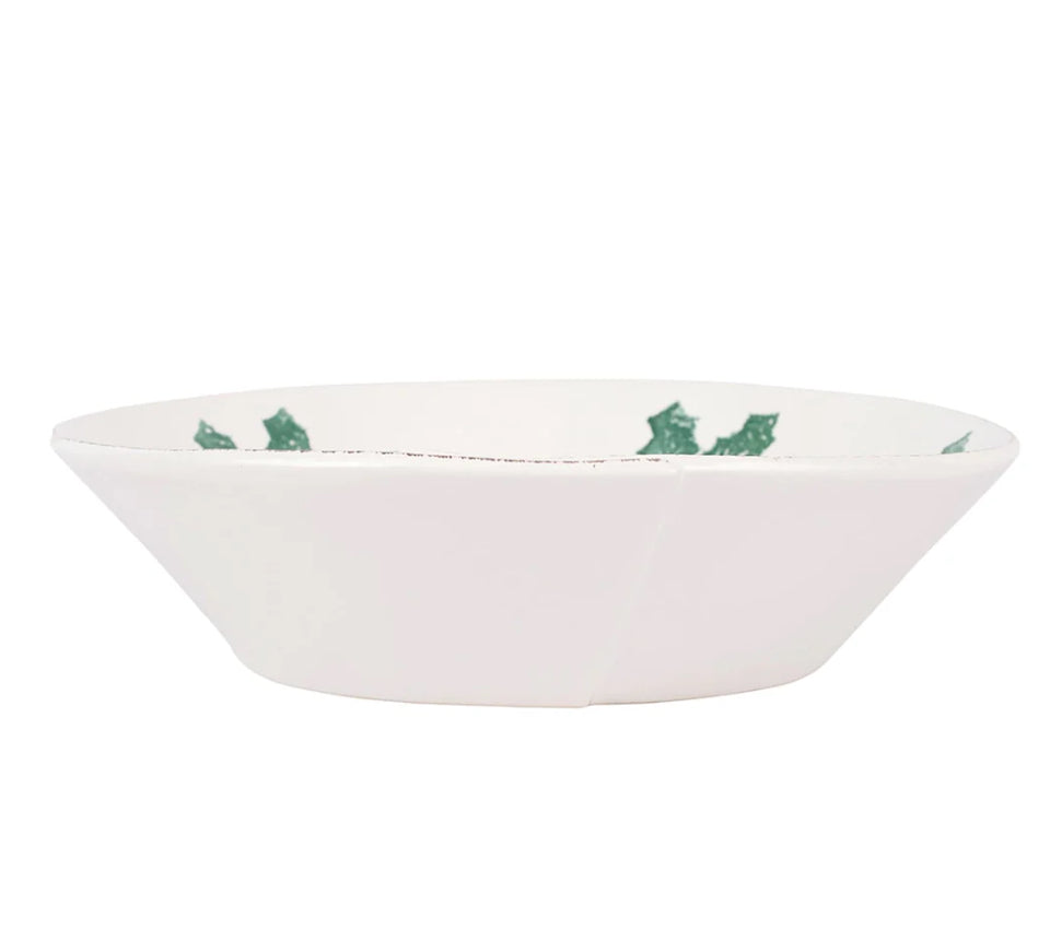 The Lastra Evergreen Shallow Serving Bowl features handpainted greenery and holly berries on a rich white background. The classic holiday color palette feels fresh on the rustic, handformed shapes, and the collection is at once elegant, artistic, and joyous.