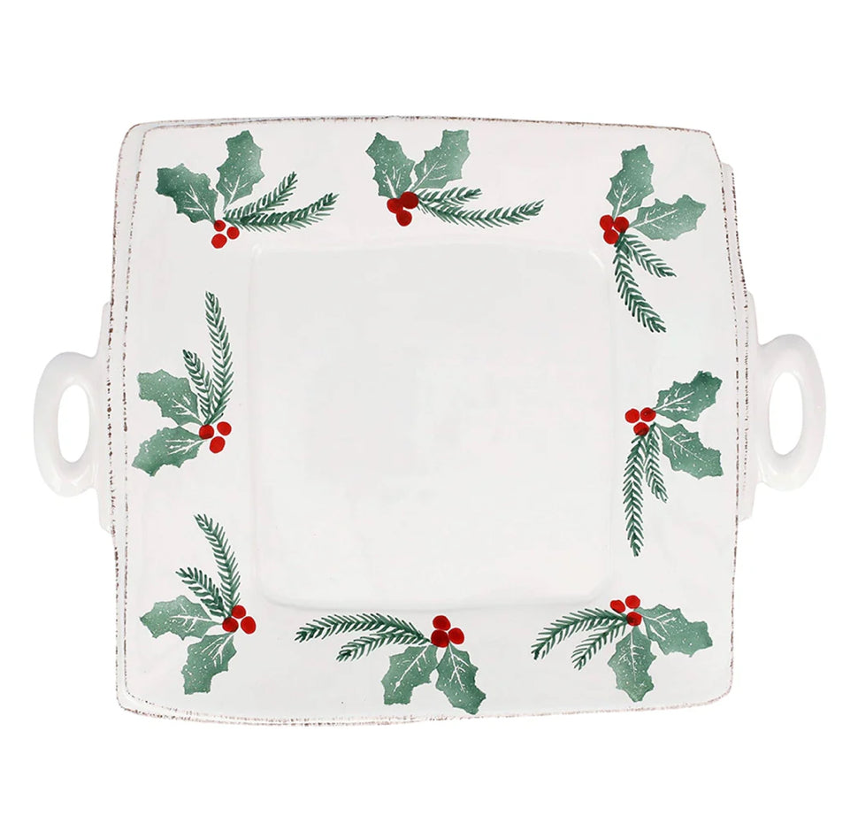The Lastra Evergreen Handled Square Platter features handpainted greenery and holly berries on a rich white background. The classic holiday color palette feels fresh on the rustic, handformed shapes, and the collection is at once elegant, artistic, and joyous.